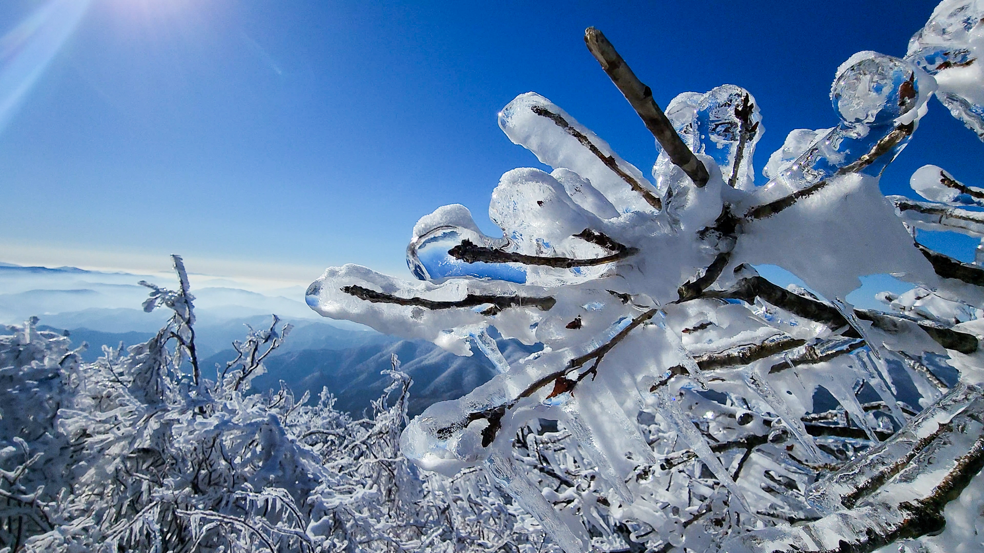 계방산은 수년 찾았지만 이런 빙화는 처음이다. 나무에 새하얀 사탕 열매가 가득하다. 탐스럽고 투명하다.