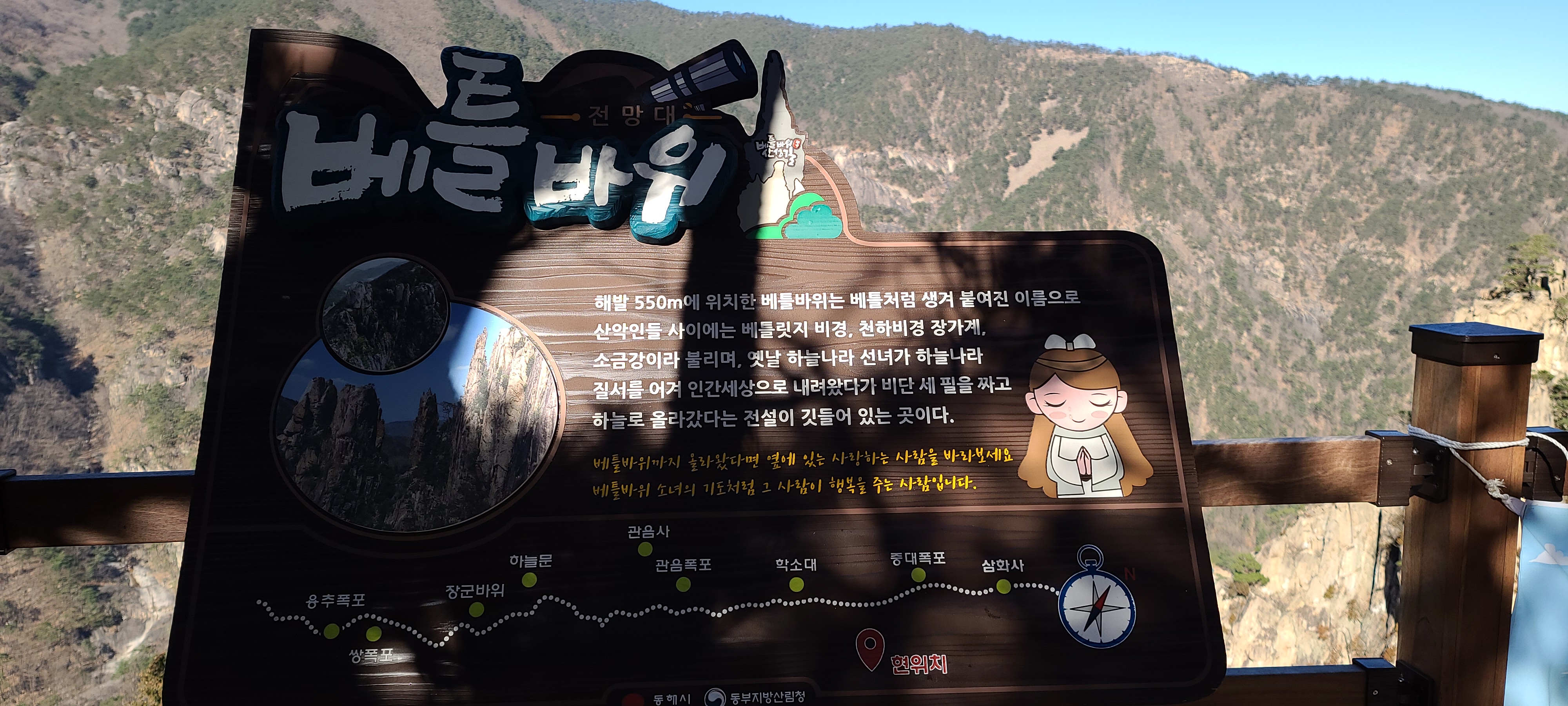 선녀가 벌을 받아 무릉도원에서 삼베 세필을 짜고 승천했다는 전설이 있다. 베틀바위 전망대에서 만나는 두타산은 매우 웅장함과 이국적인 느낌이 많이 든다.