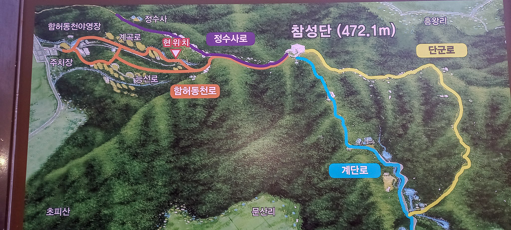 등산코스 : 마니산 함허동천 주차장 - 능선로 - 암릉구간 - 참성단 - 계곡로 - 함허동천 주차장 원점회기