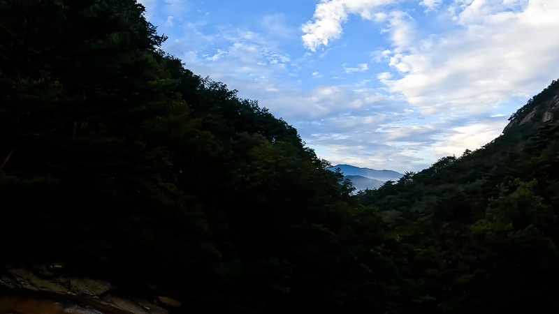 하늘이 예쁘다. 그리고 저 멀리 운해도 보인다. 능선에 오르면 운해는 사라질 것 같다. 하늘이 예뻐 기분도 좋다.