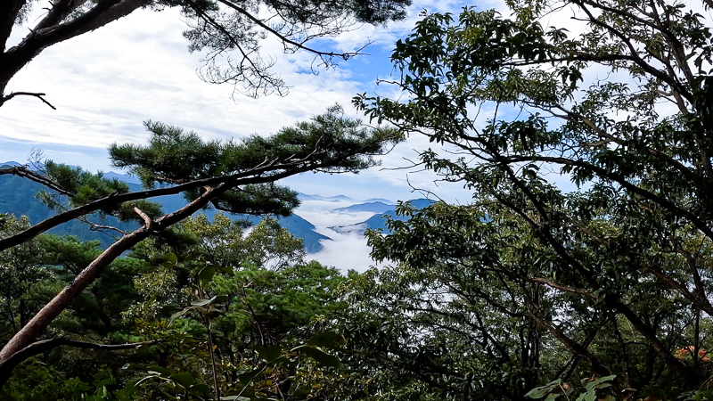 책바위 코스로 발걸음을 빠르게 채 촉했다. 등로에는 도토리가 많이 떨어져 있다. 뭔가를 살피는 시간이 없다. 일단 운해가 있는지 확인이 중요했다. 저 멀리에 운해가 보인다. 맑은 하늘과 운해가 심장을 뛰게 한다. 설렌다.