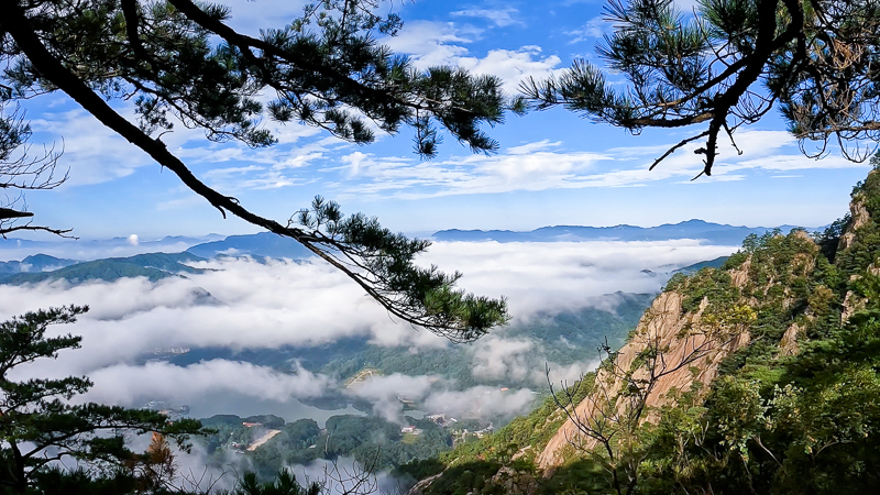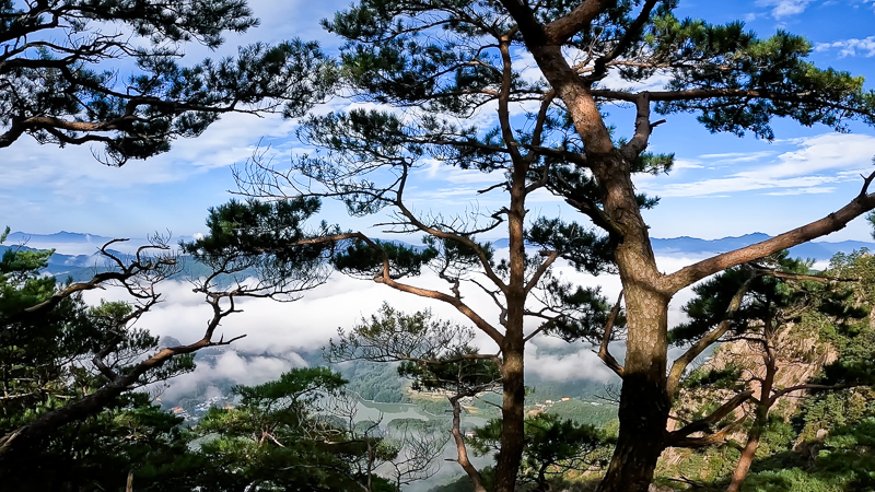 책바위 아래 산정호수 위에 운해가 보인다. 소나무 사이 보이는 운해가 너무 예쁘다. 넓게 핀 운해가 잘 조망이 안된다. 운해는 시간이 지나면 그 아름다움이 조금씩 시간의 흐름에 맞추어 사라지기 때문에 운해 핀 산정호수를 찾아 발거음을 급하게 옮기게 되었다.
