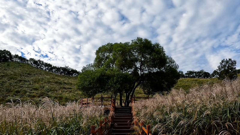 억새 밭에 도착을 한다. 저 멀리 바라보니 억새 밭에서 하루를 보낸 백팩커들의 모습도 눈에 들어온다. 하지만 잔잔한 하고 청명한 하늘 그 아래 억새가 좋다. 하지만 올 해는 다른 해보다 억새가 많이 피지는 않은 거 같다. 전 보다 풍성함에 있어 조금 못 한 느낌이다.