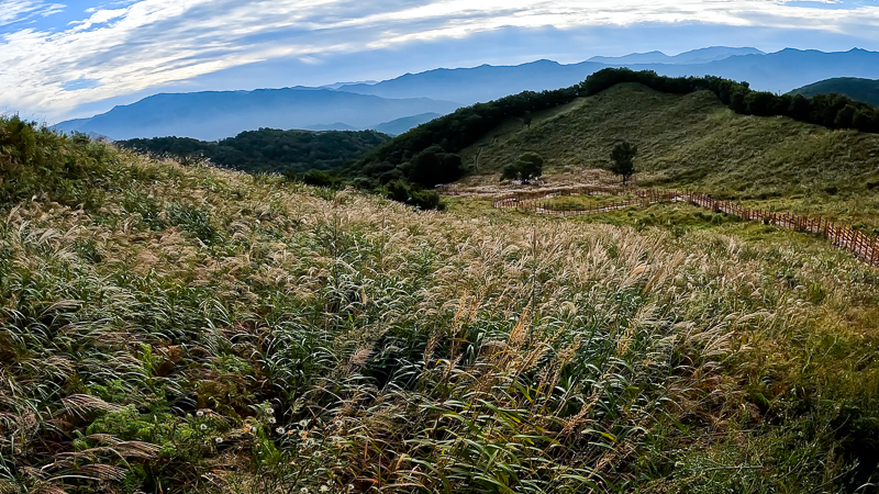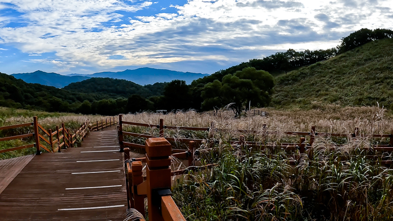 산그림과 억새가 참 예쁘다. 조금 이른 억새 밭의 모습이 청 억새에서 색을 달리하고 있고 하늘은 시야의 첫 지점과 끝 지점의 색이 층층이 되어 있어 하늘이 예쁘다.