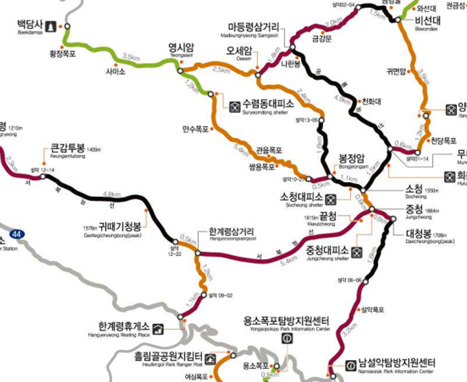 다음 소개드릴 코스는 오색에서 대청봉을 오른 후 소청 봉정암 구곡담계곡 백담사로 이어지는 코스입니다.