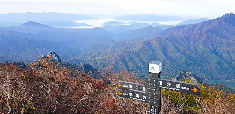 등산코스 : 한계령휴게소 - 한계령삼거리 - 귀때기청봉 - 큰감투봉 - 대승령 - 대승폭포 - 장수대분소