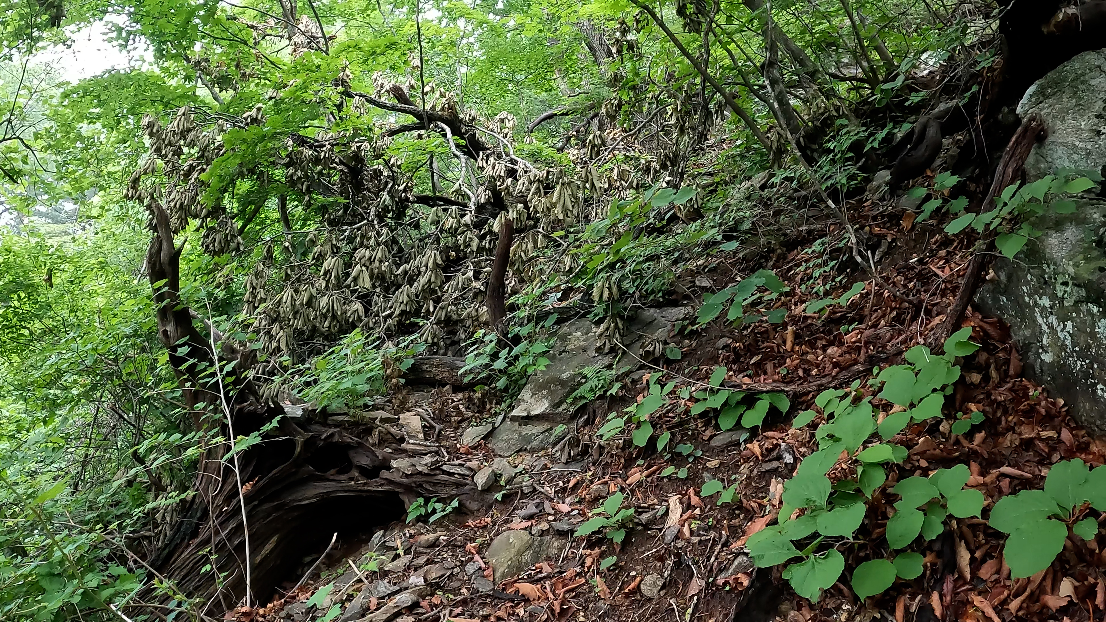 어제 비가 와서 폭포는 정말 아름다웠는데 여기서부터 알바와 고난이 시작되었습니다. 길에 신발은 비가 온 후라 푹푹 빠지고 미끄러워 진행이 어려웠습니다. 그리고 무엇보다 산사태로 인해 길이 없는 경우가 너무 많아 길을 찾을 수 없었다는 게 가장 큰 문제였습니다. 순간 어떻게 하지라는 생각에 맨탈이 흔들리기도 했습니다. 독주골로 하산을 한다는 건 더 위험할 것 같고 만나고 온 칠점사가 다시 기다리고 있을 거 같고 정말 난감했습니다.