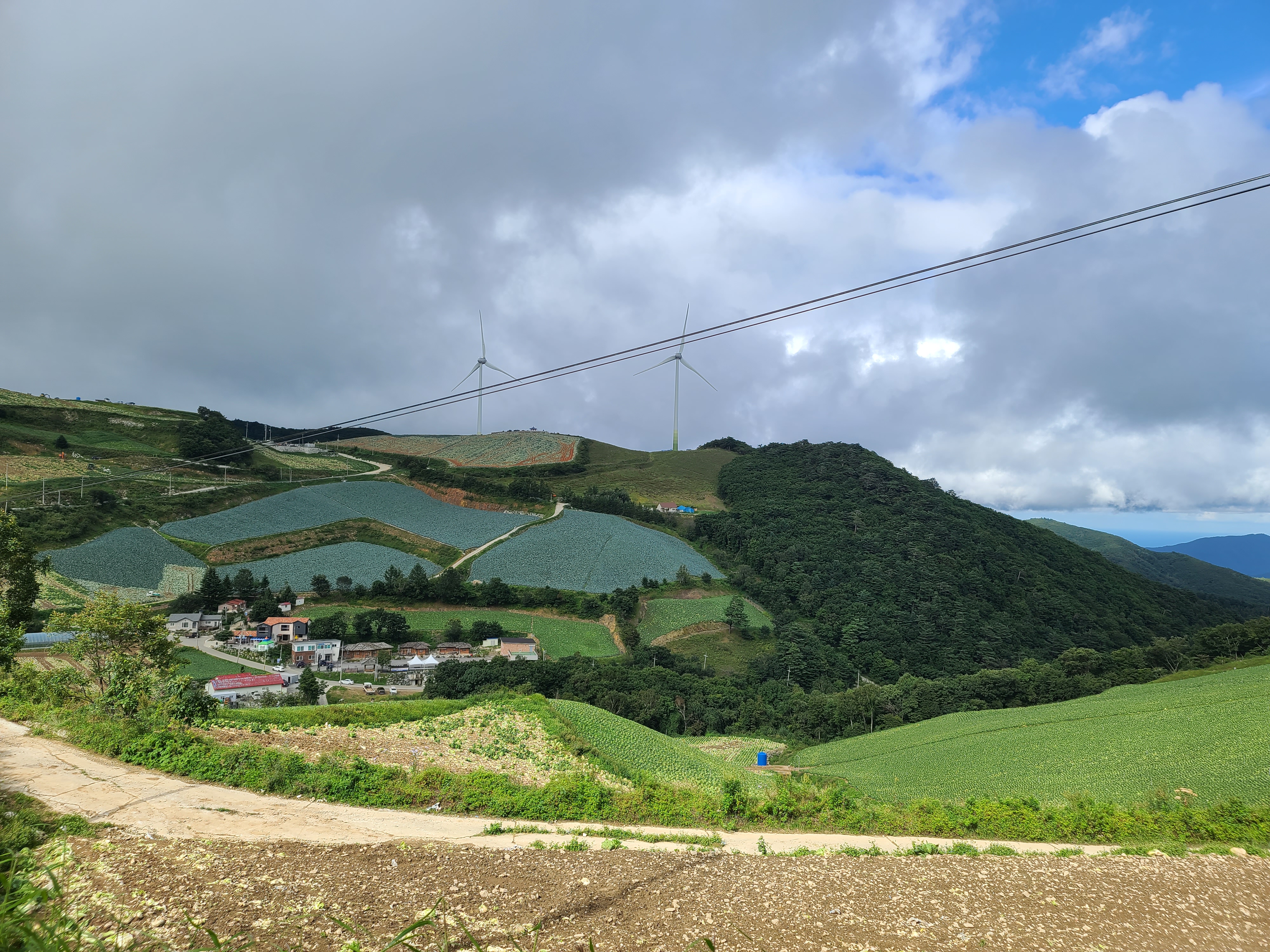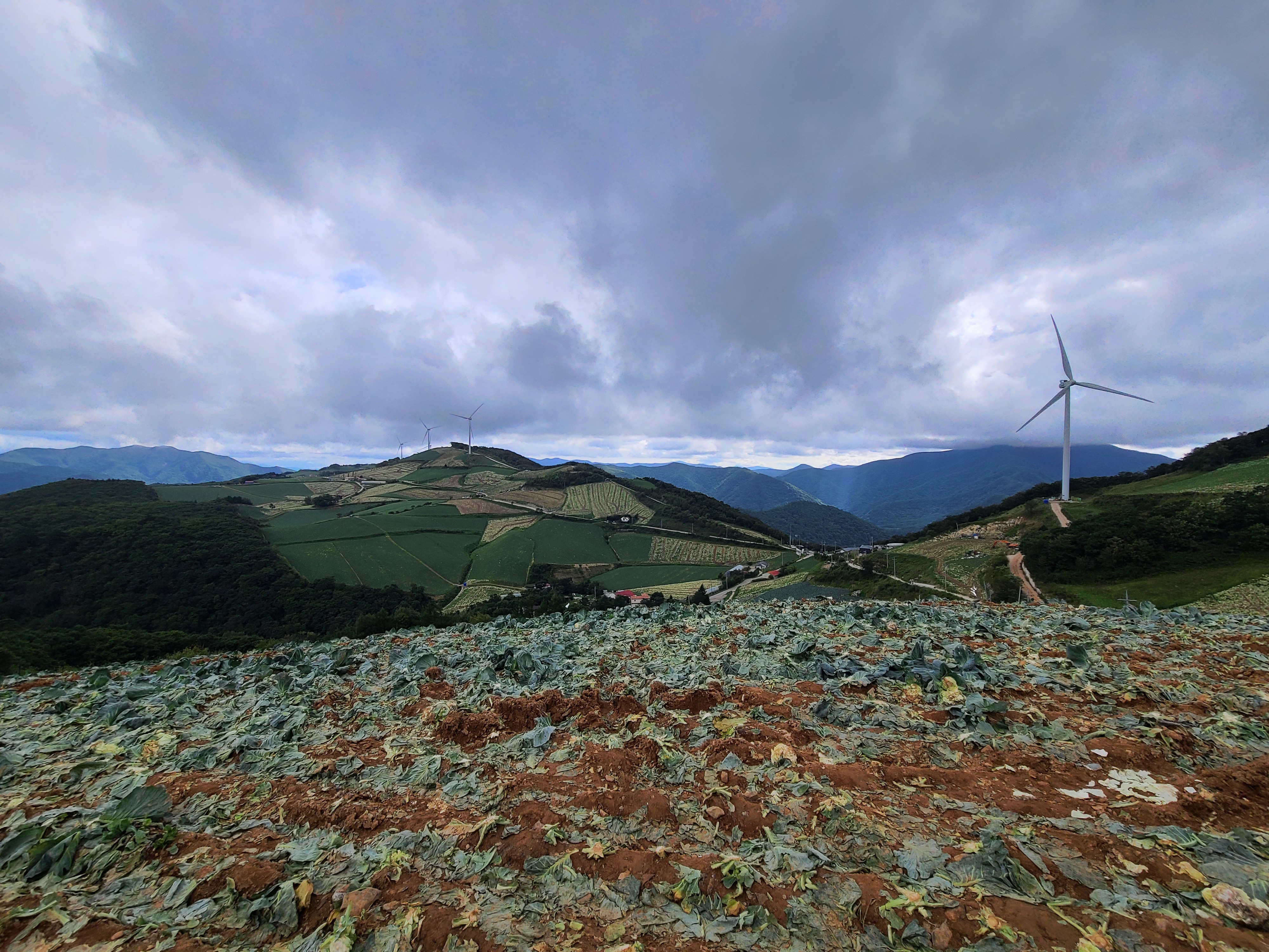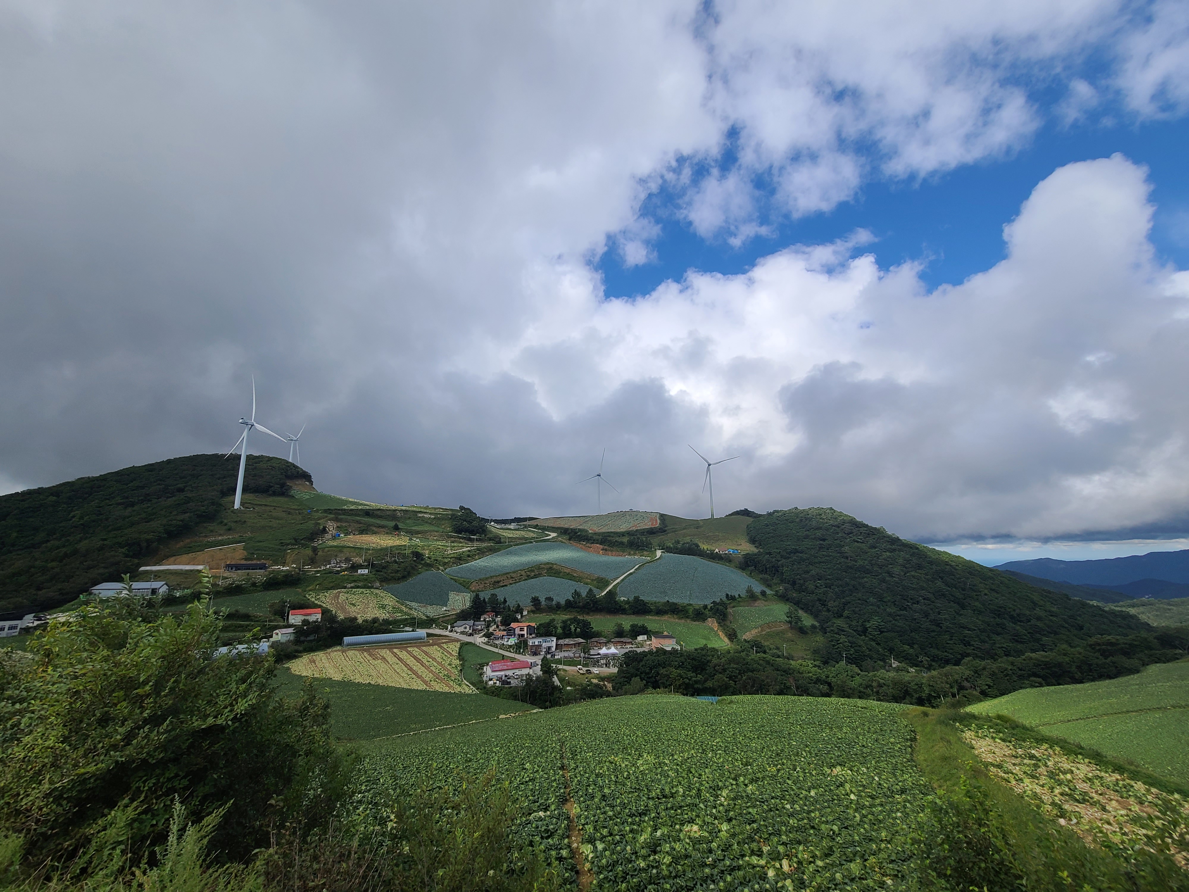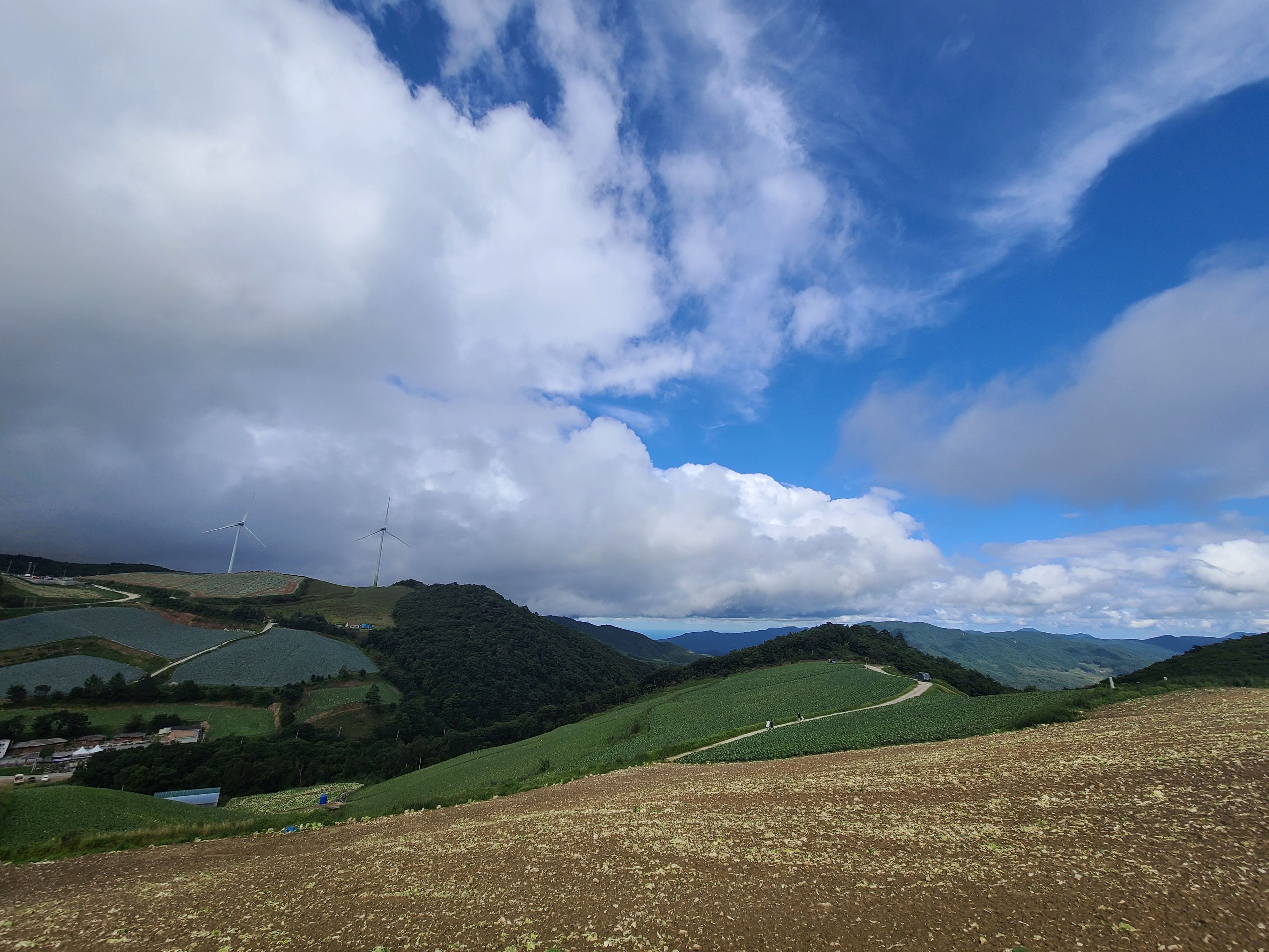 수확을 한 장소도 있고 지금 수확을 하는 것도 보인다. 배추 잎싸귀가 이렇게 컷던가라는 생각을 하게 된다. 그리고 눈에 들어온 풍령발전기와 능선에 보이는 작은 정자들. 이 모습을 바라다보다 안반데기 전체 모습에 넋을 잃고 바라다보게 된다. 무척 무더운 하루인데 여기는 서늘해서 바람막이를 걸치고 산책에 나섰다. 이 여름에 이렇게 시원한 장소가 또 있을까 생각해 본다.
