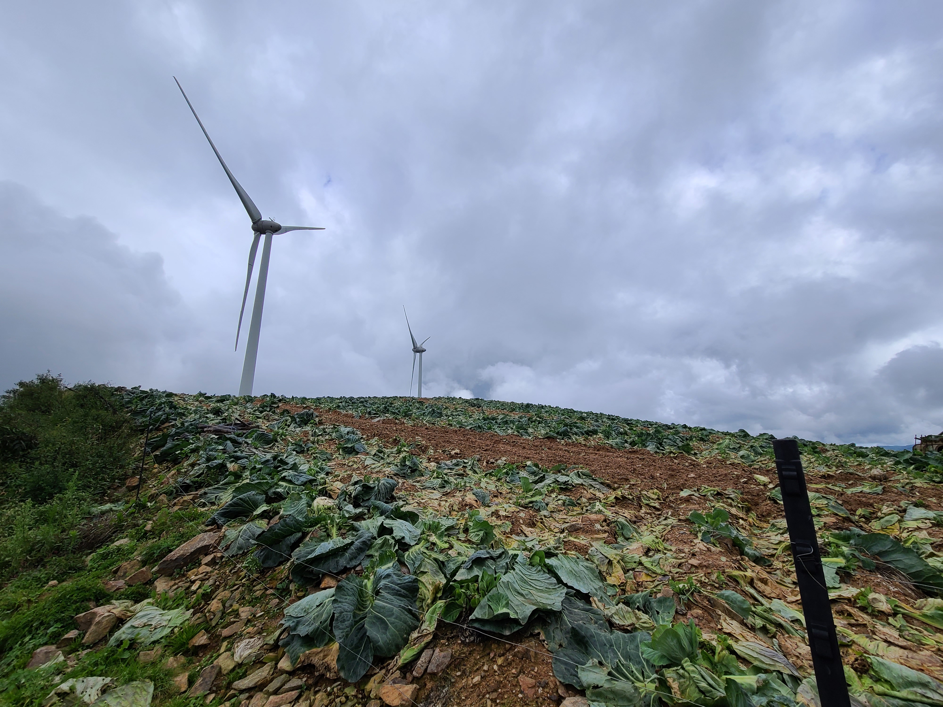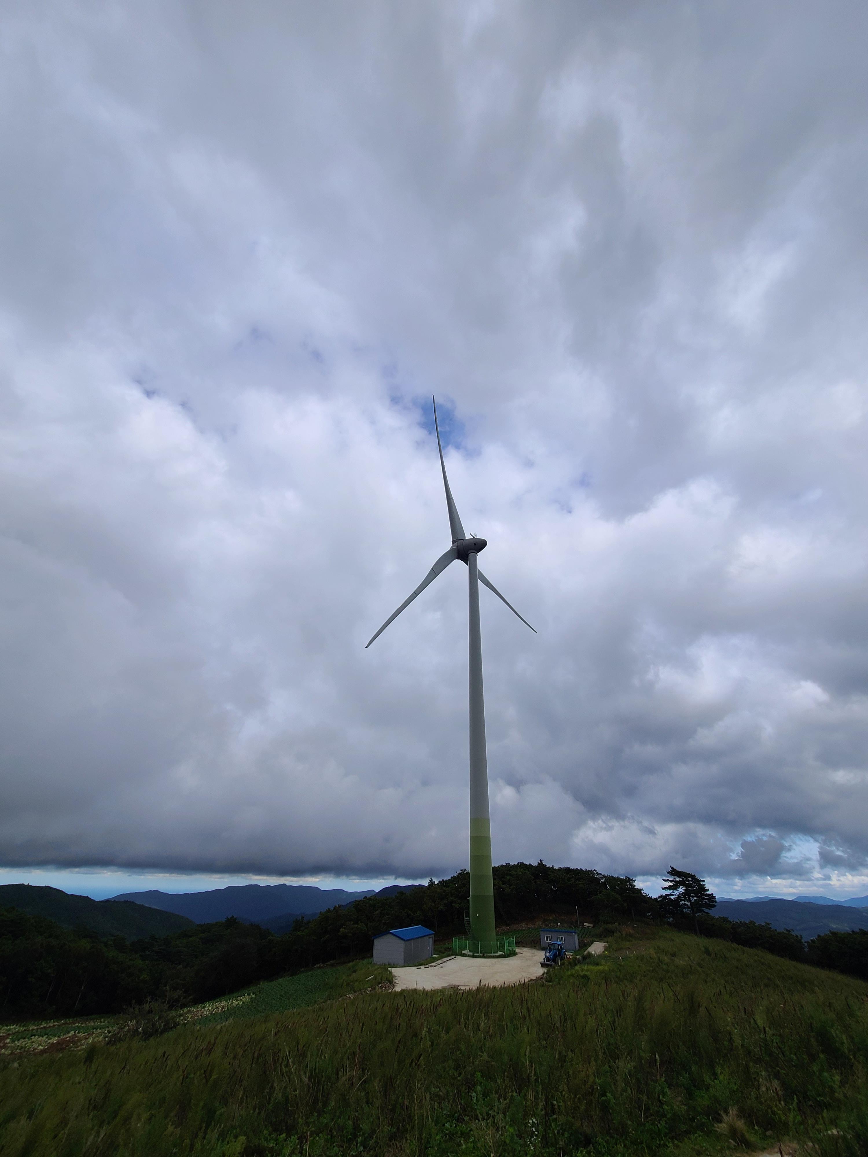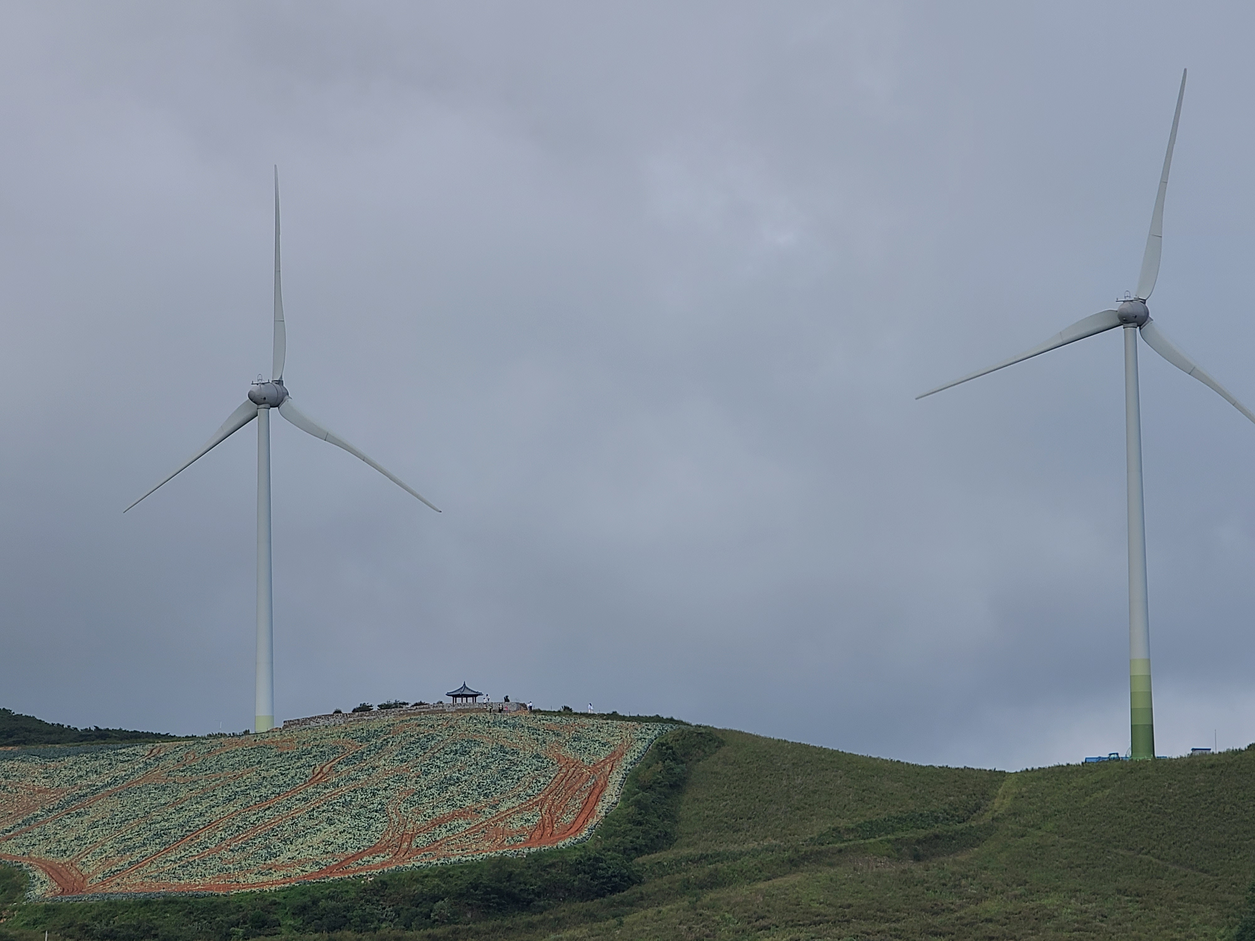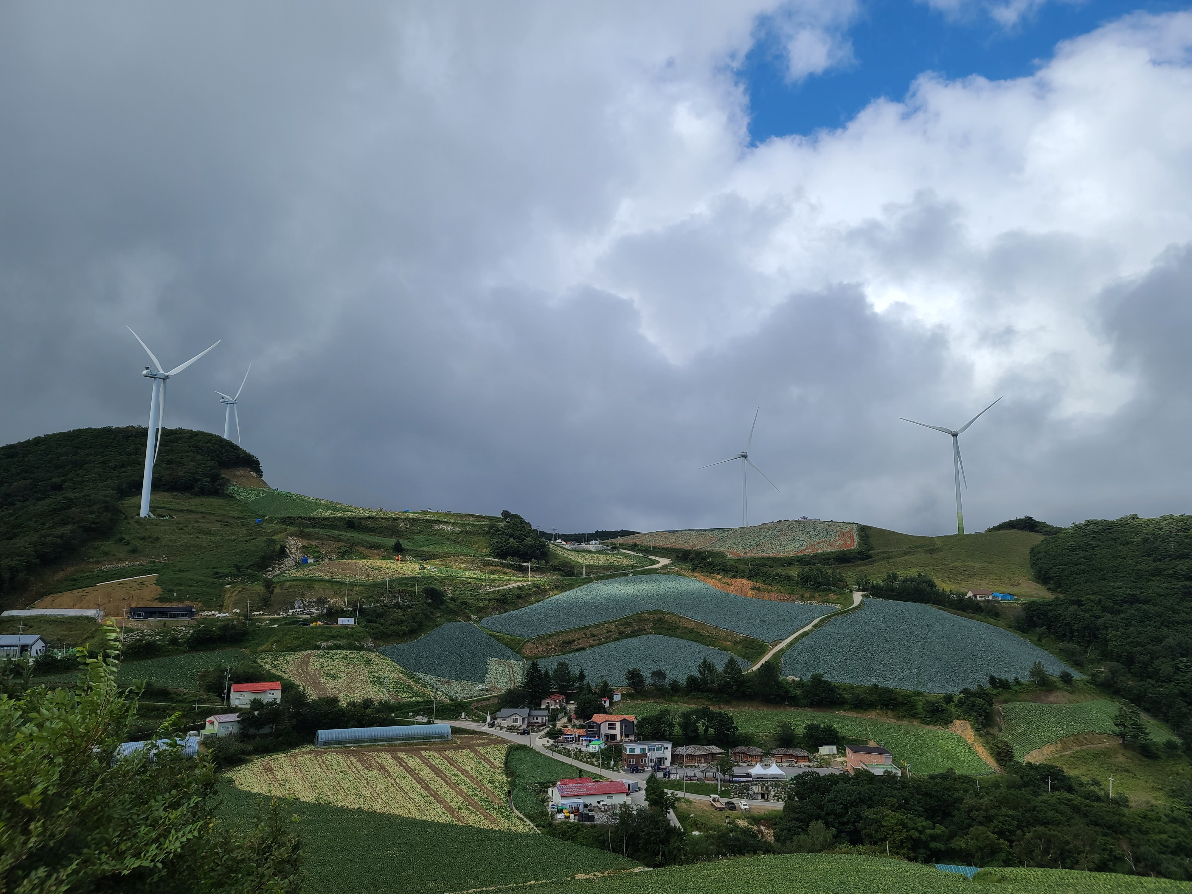 수확을 한 장소도 있고 지금 수확을 하는 것도 보인다. 배추 잎싸귀가 이렇게 컷던가라는 생각을 하게 된다. 그리고 눈에 들어온 풍령발전기와 능선에 보이는 작은 정자들. 이 모습을 바라다보다 안반데기 전체 모습에 넋을 잃고 바라다보게 된다. 무척 무더운 하루인데 여기는 서늘해서 바람막이를 걸치고 산책에 나섰다. 이 여름에 이렇게 시원한 장소가 또 있을까 생각해 본다.