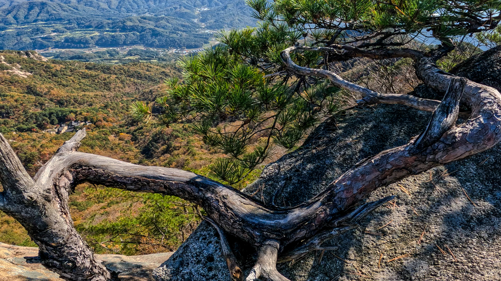 계단 구간이 끝이 나면 한그루의 소나무를 만나게 된다. 소나무와 운악산의 경관이 매력적이다.