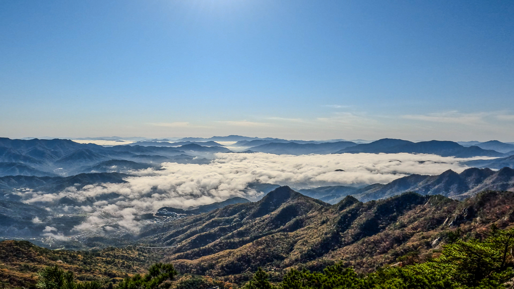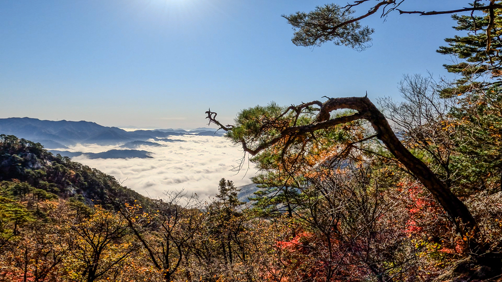 이른 아침 운악산의 가을 풍경이다. 안개가 걷히며 조금씩 운해가 되어 가고 있다.