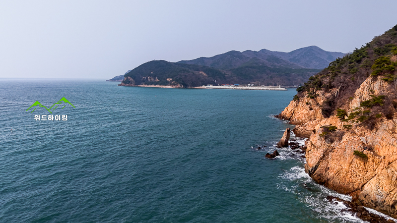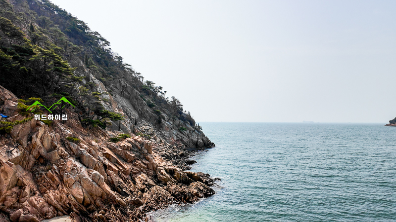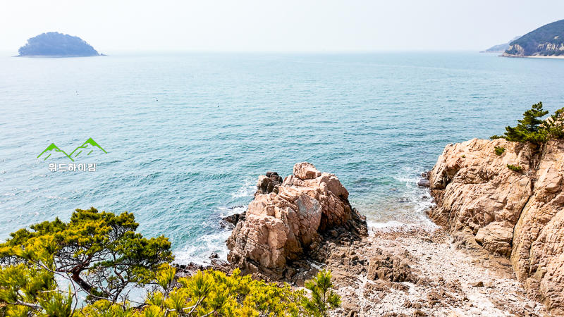명사의 해변으로 내려가는 길은 그리 가파르지 않고 소나무 길과 해녀섬, 해안절벽에 파도가 들이치는 모습을 감상하며 내려가면 된다.
