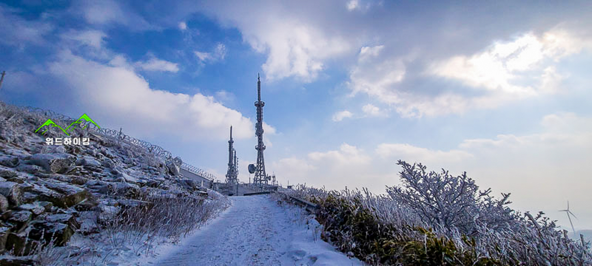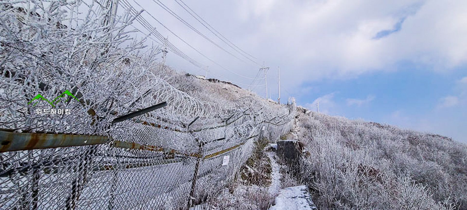 송신탑의 그물망에도 눈꽃이 만들어졌다. 이 모습과 능선의 아름다움이 태기산 겨울의 매력이다.
