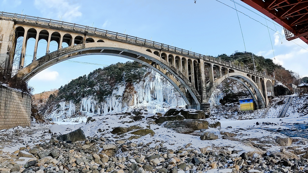 1948년 소련식 유럽공법으로 착공하게 된 다리입니다. 승일교 옆에는 인공폭포를 만들어 겨울 물윗길을 더욱 아름답게 하고 있습니다. 승일교는 분단과 한국전쟁의 역사를 상징하는 문화유산으로 평가받고 있습니다. 이 장소에서 사진 촬영을 하면 인생샷이 나올 정도로 아름다운 장소입니다.