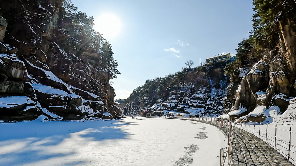 직벽에 떨어지는 듯한 물길이 얼어붙어 장관을 이룬다.