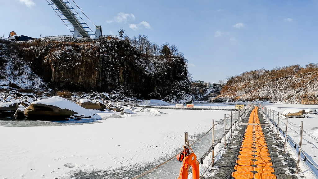 부교를 걷다보면 플라스틱으로 만들어져 소리가 난다. 조금 미끄럽기도 하다. 부교 위를 걷는 맛도 한탄강 물윗길의 또 다른 경험이다.