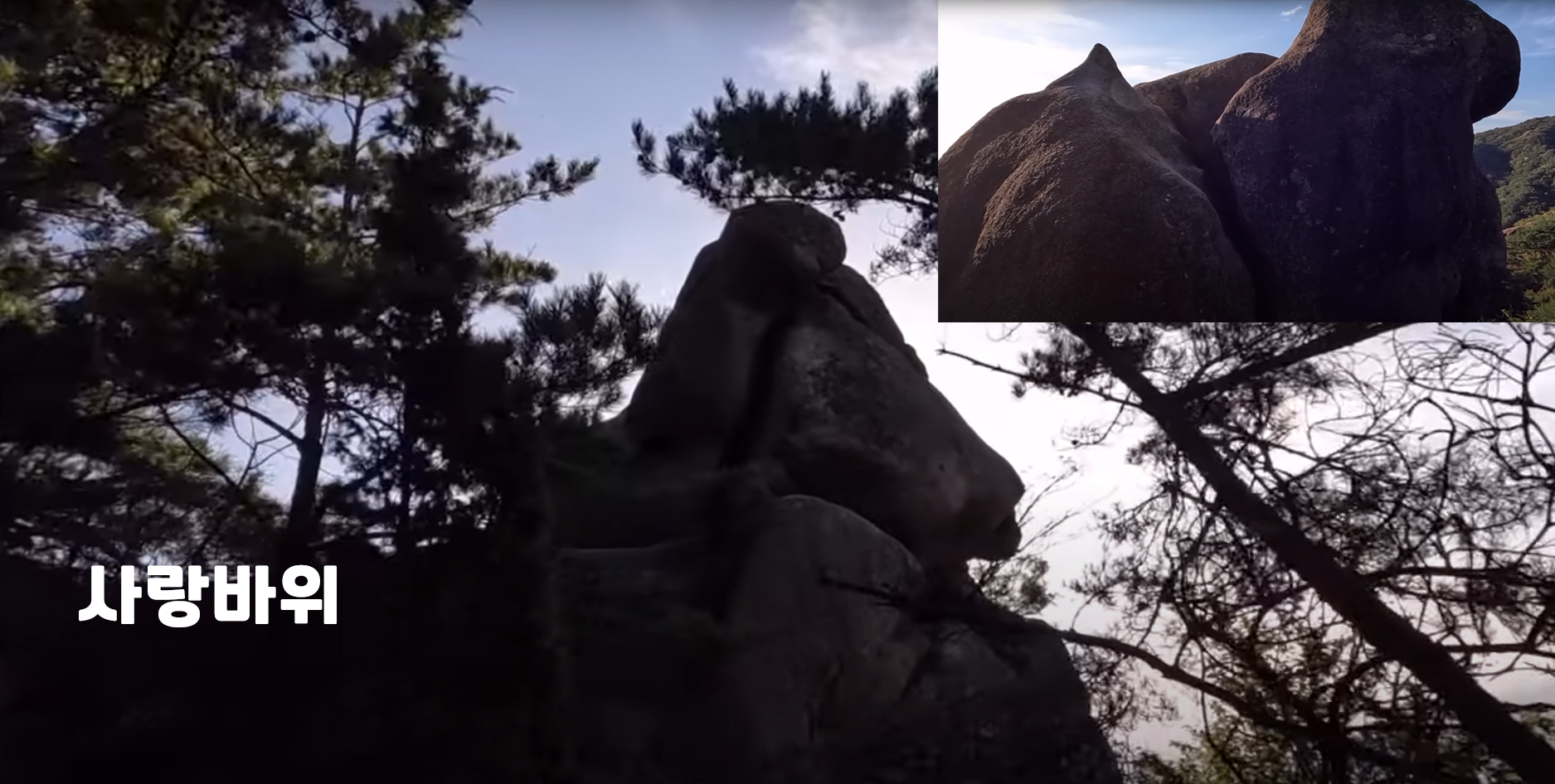 숨을 헐떡이다 고개를 들어보니 사랑바위가 보인다. 두 바위가 서로 부둥켜안고 있는 모습이다.