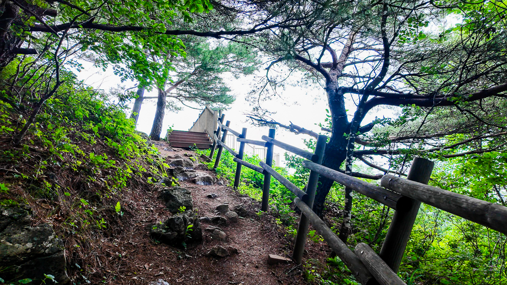 민둥산 대표적인 코스인 중산초교에서 오르면 만나는 쉼터이다. 민둥산까지 1.3k 거리인데 약 700m를 오르면 능선과 만나게 된다. 습도가 높은 편이었고 전 날 비가 내려 등산로는 미끄러운 편이었다.