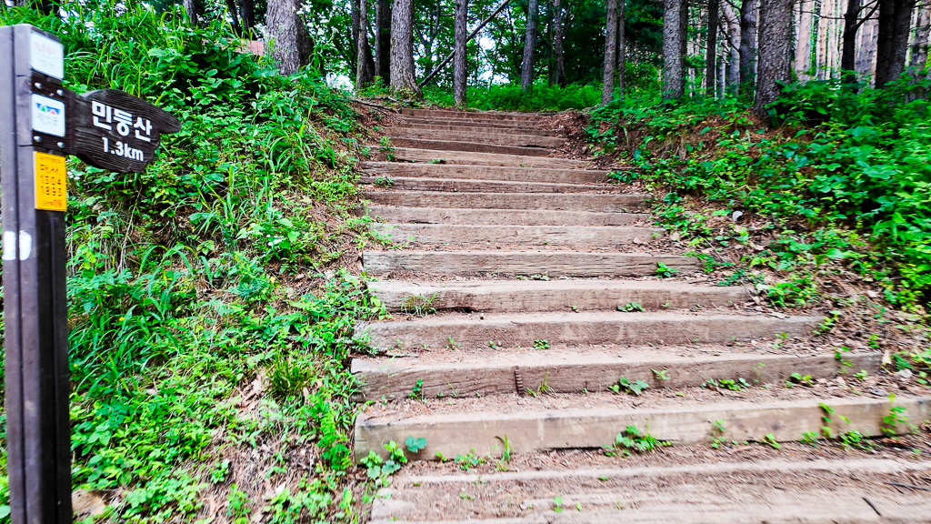 - 민둥산의 대표적인 코스 중산초교 고도가 519m이다. 정상까지 고도차가 600m이다. 완만한 육산의 형태로 큰 어려움 없이 산행이 가능하다. 편안한 복장이면 충분하다.