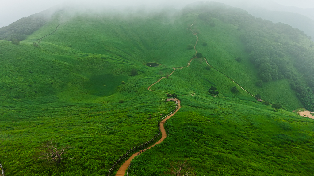 민둥산 돌리네를 중심으로 연무가 흘러다닌다. 정상에서 돌리네를 중심으로 한바퀴 돌아본다.